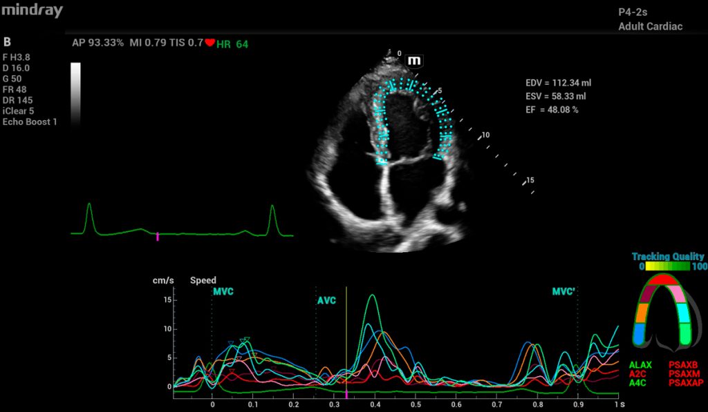 Las aplicaciones cardiovasculares tienen altos requisitos de rendimiento de imagen y resolución temporal. El MX7 proporciona soluciones cardiovasculares avanzadas de fácil acceso: no solo funciones avanzadas como TT QA, y Auto EF, sino también las distintivas como RIMT y R-VQS.